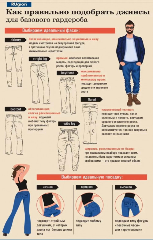 Самый простой способ узнать свой размер джинсов — вычесть из российского размера одежды 16. То есть, если Вы носите 48 размер одежды, Вам подойдут джинсы 32 размера. Однако такой подход годится только в случае, если у Вас стандартная фигура, что случается редко. Поэтому производители шьют джинсы для людей разного роста и комплекции.